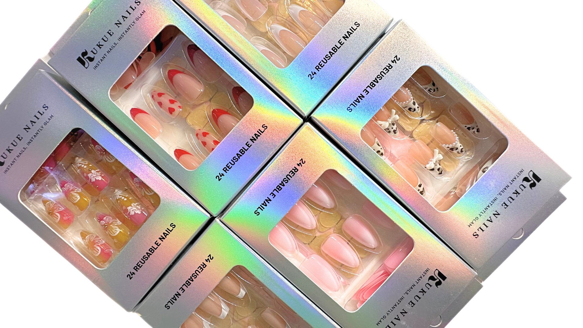 Kukue Nails offers high quality and affordable press-on nails . Each set includes a cuticle wand, mini buffer, and adhesive stickers, giving you everything you need for a quick at-home manicure.